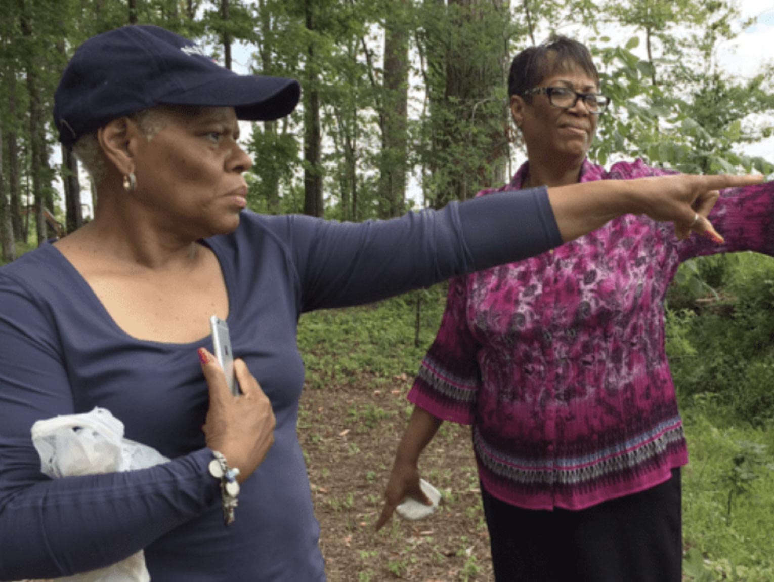 Yvonne Horton, left, and Alfenette Robinson point in the direction of the unmarked black cemetery. Both women have relatives buried there.