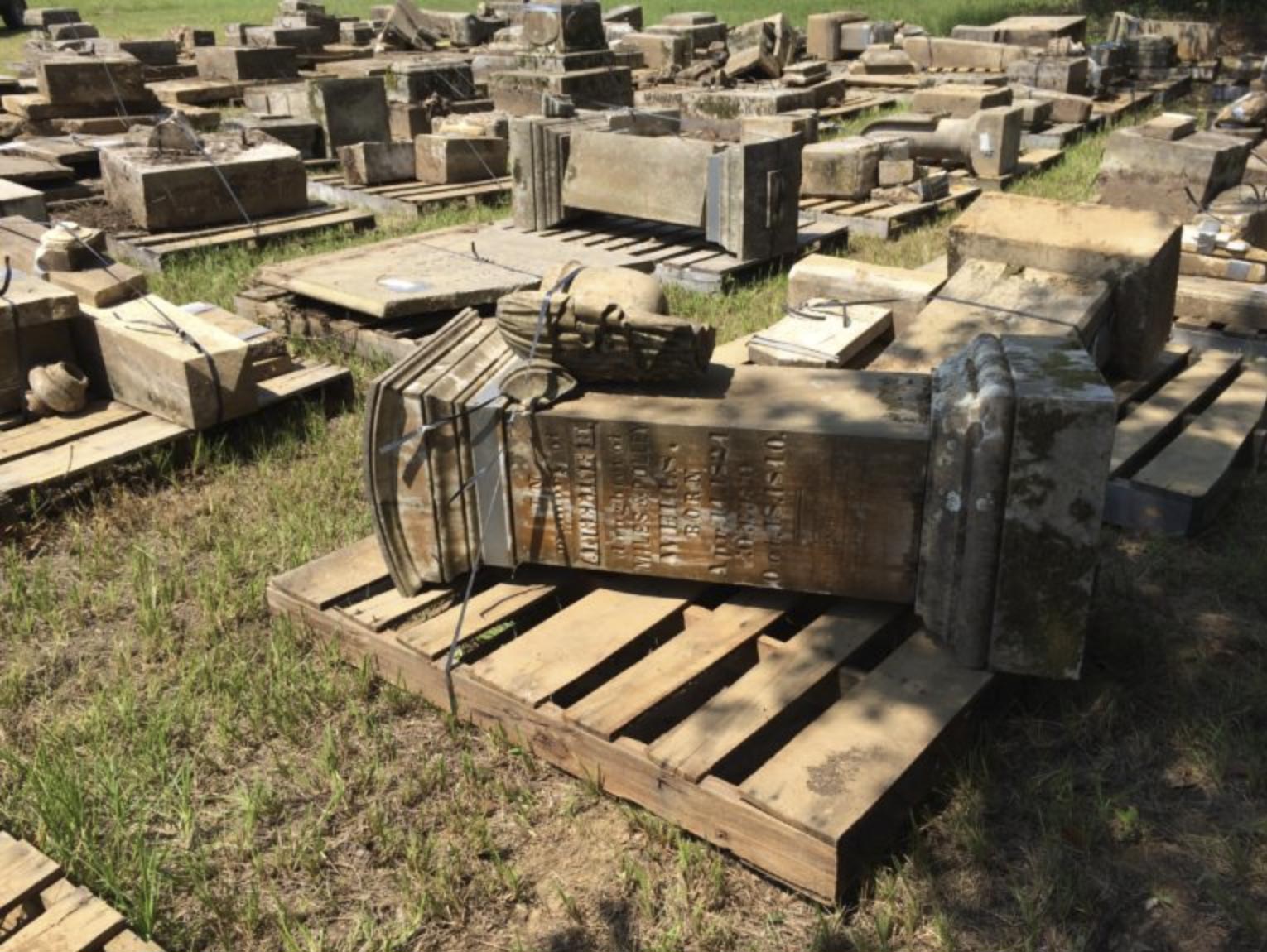 Headstones from the white cemetery await their associated human remains at the Bolton cemetery.