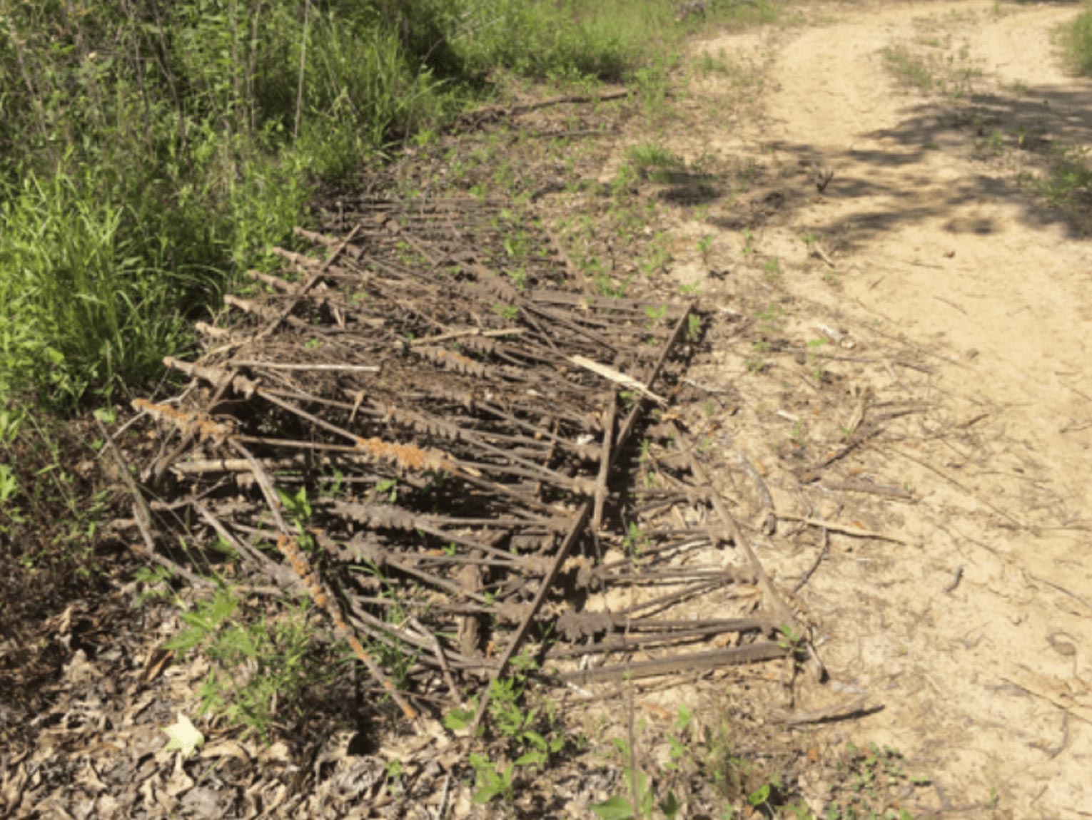 Cast-off cemetery fences lie along a logging road near the New Salem cemetery. After the state Department of Archives and History was informed about the fences, they were moved with the headstones to the Bolton cemetery.